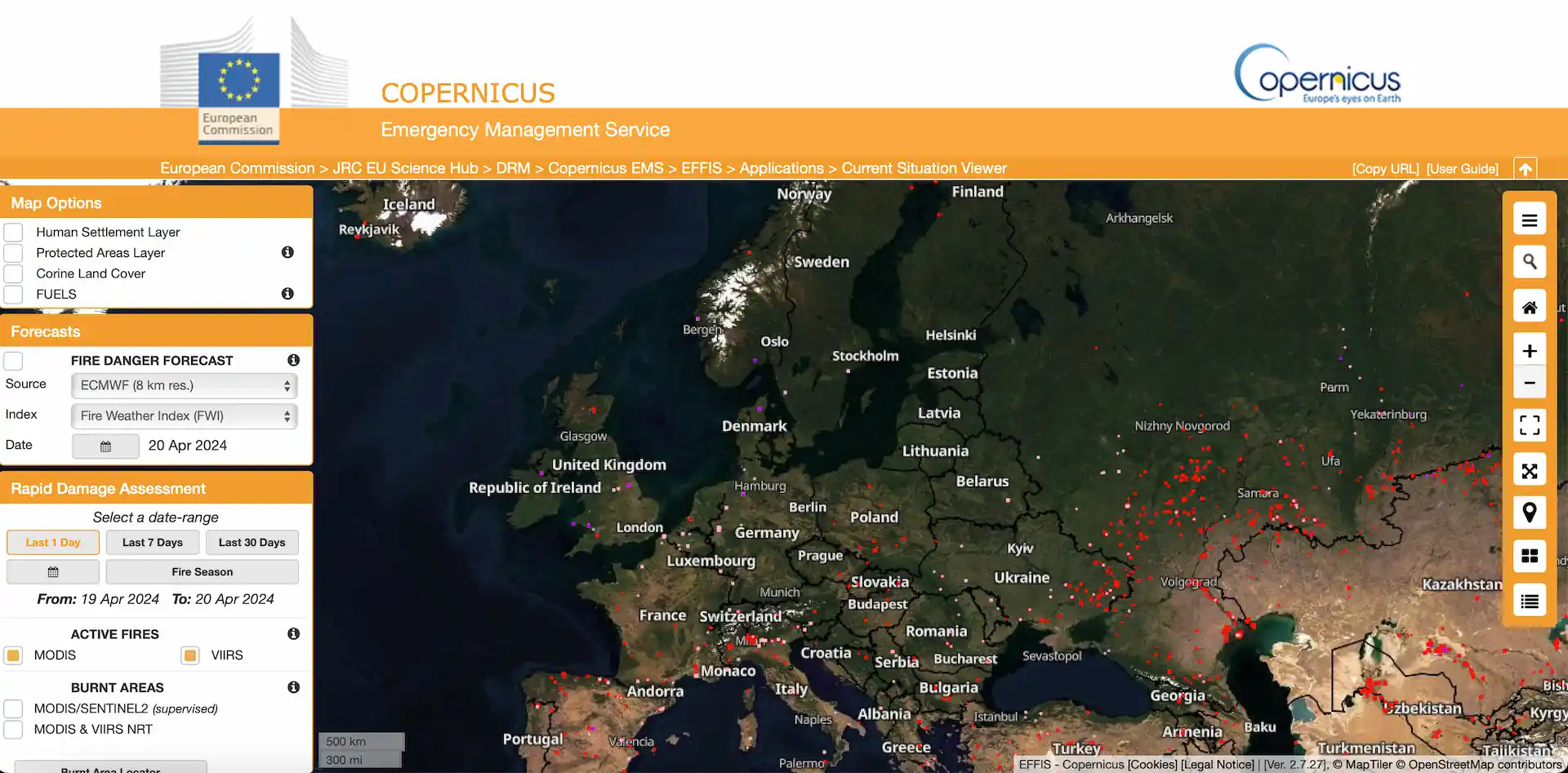 At a more immediate tactical level, EFFIS offers a Current Situation viewer which can give both a local and continent wide view. This app allows users the ability to focus on ‘their own fire’ in a national or regional sense and get an overview of how it is behaving, what fuel sources are available to it and what areas have already been burned this season, along with displaying jurisdictional boundaries and built up areas. It also gives a forecast out to eight days, which coupled with a Fire Danger Forecast out to ten days (based on the Canadian Forest Fire Weather Index or FWI), allows those fire officers responsible for local distribution of assets a chance to plan, rotate units and call for extra assets with a reasonable degree of accuracy. Much of the information in the Current Situation viewer is based on satellite observation of the area, using Moderate Resolution Imaging Spectroradiometer( MODIS ) which detects areas of ground hotter than their surroundings with a resolution of 1Km, and Visible Infrared Imaging Radiometer Suite (VIIRS) which has a higher resolution at 375m, and is more useful at detecting fires overnight. Both satellite systems act in a complementary fashion to provide an accurate picture of emerging hot spots in near real time, without giving false alarms every time someone strikes a match.