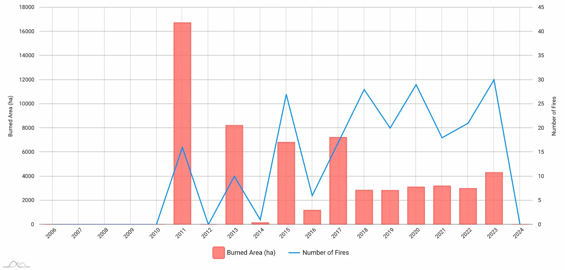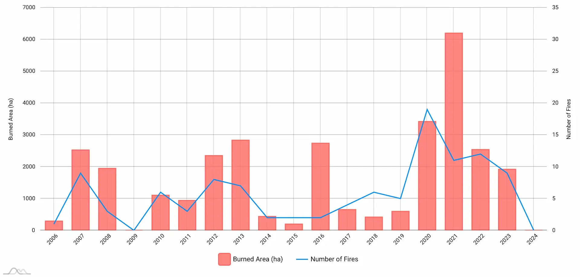 What then does EFFIS do for its users in practise? Accessible online by anyone, EFFIS makes a vast amount of data, trends, and forecasts available in one place. This is a valuable asset for those whose position requires them to make evidence based decisions on the distribution of funds and assets, both at the national level and at an EU level. There are specific features which work well to support users at different decision-making strata. In terms of setting up policy makers to assign funding and assets correctly, data is presented through a Statistics Portal which, at a glance, provides data on fire activity both at a member state level and also encompassing averages that affect the whole of the EU, with trends shown dating back to 2006. This data is presented in an easy to understand manner covering current year activity against a backdrop of max/min averages from the last fifteen years.