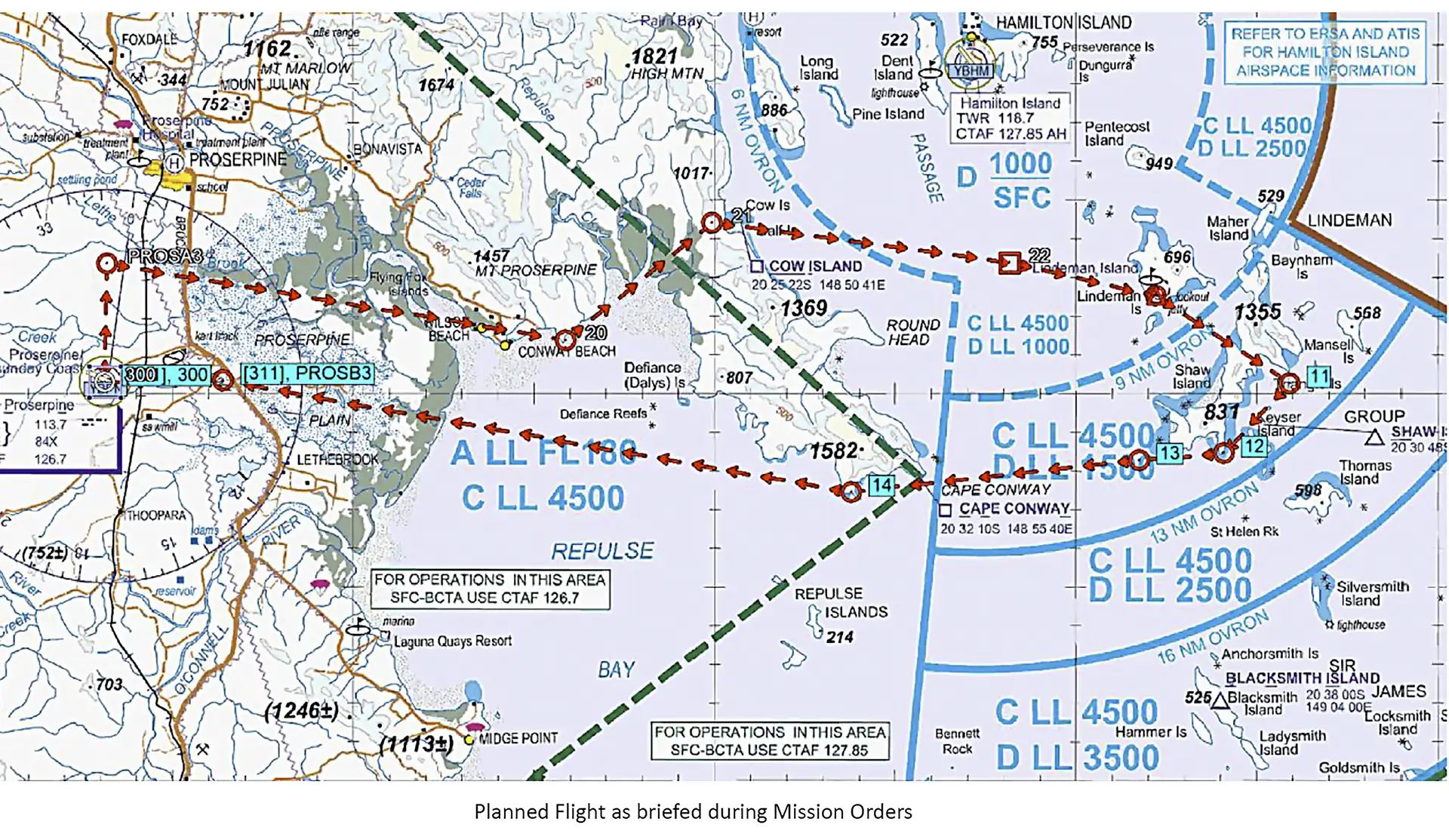 On the night of 28 July 2023, a formation of four MRH-90 helicopters (Callsigns “Bushman” 81,82,83 and 84) was tasked to conduct a night extraction of ground force elements from Lindeman Island as part of Exercise Talisman Sabre 23. Bushman 83, the accident aircraft, was the third aircraft in the formation. The crews commenced duty at 13:00 local time, received mission orders at 14:10 and conducted a Rehearsal of Concept (ROC). A ROC is a ‘walkthrough’ of the mission which, according to the report, is often used as an additional risk control to identify and brief contingency plans. B83 (Bushman 83) started engines at 21:14, and at 22:14, the B83 departed Proserpine as number three in a heavy left formation.