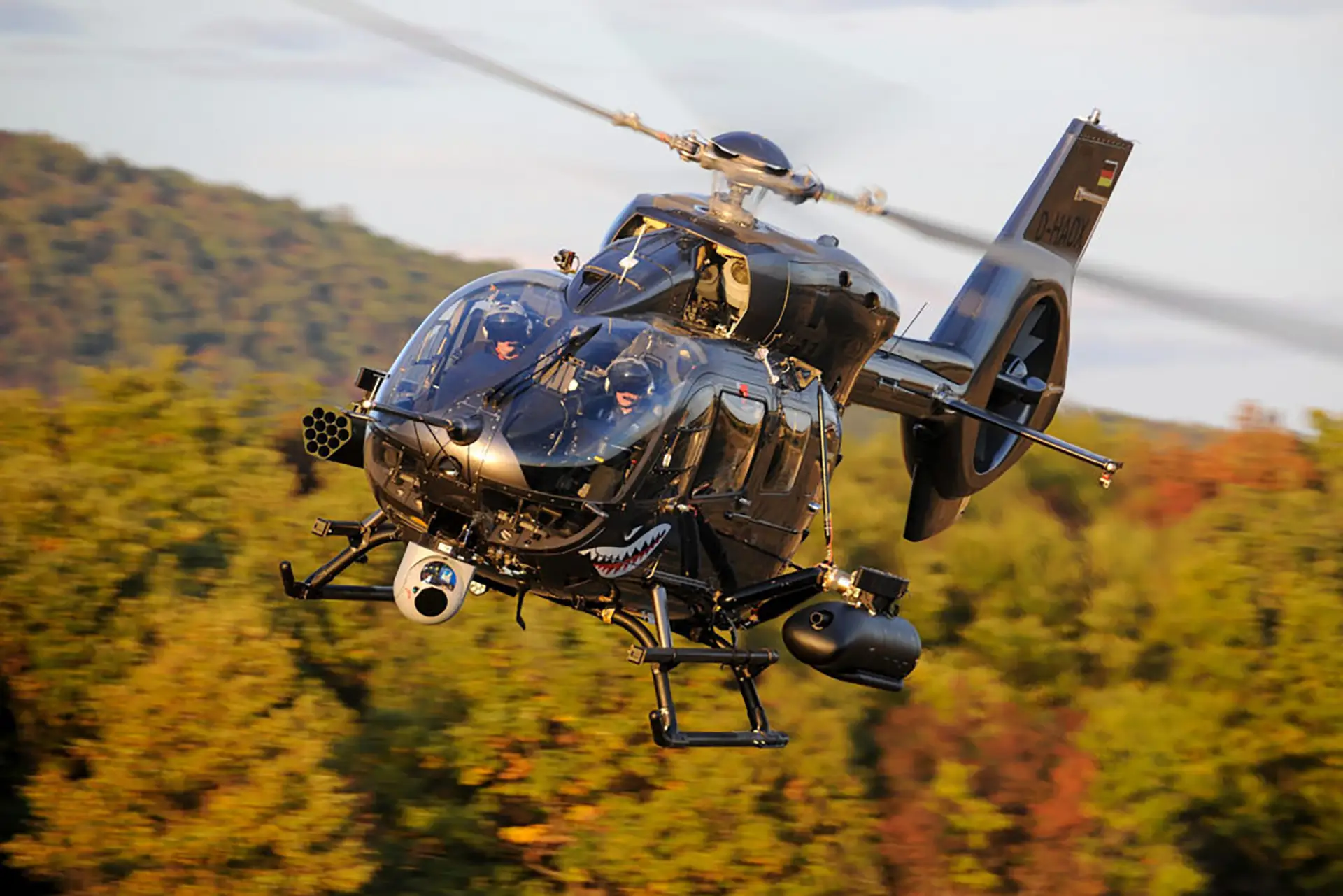 Pretty in terms of an attractive camouflage paint scheme and, most importantly, shark’s teeth either side of the nose. To paraphrase Jane Austen, it is a fact universally acknowledged that essentially all flying machines look better with shark’s teeth painted on them - and the H145M is no exception. Pugnacious as the normally somewhat sleek, bordering on effete, lines of the civil H145 were considerably changed by the fitment of Meeker mounts equipped with flare dispensers, CMX-15D EO/IR turret and Missile Warning Sensors on the nose, and, finally, HForce weapons pylons either side of the fuselage. The CMX-15 being an ITAR-Free version of the ever-popular MX-15 family of EO/IR systems. The pylons were equipped with a 2.75" rocket pod on the port station and a podded FN 12.7mm gun on the starboard.