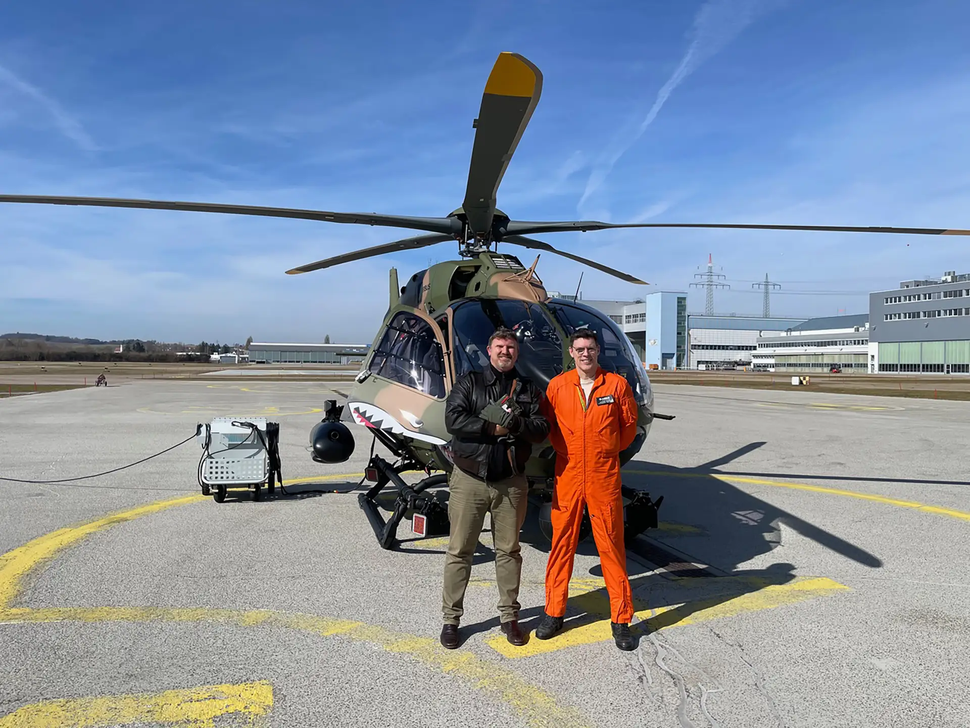 My pilot for the day, Raymond, took me through a swift familiarisation and fit of the helmet and HMSD combination, before outlining the sortie profile. The key objectives were to assess the Handling Qualities improvements afforded by the latest version of the Helionix cockpit and auto pilot, as well as the workload reduction and situational awareness enhancements provided by the twin-channel FADEC and HMSD, before completing some Simulated Attack Profiles (SAPs) to investigate the systems integration of HForce. We completed the safety brief and strolled to the aircraft on a cool and crisp Spring morning at Donauwörth.