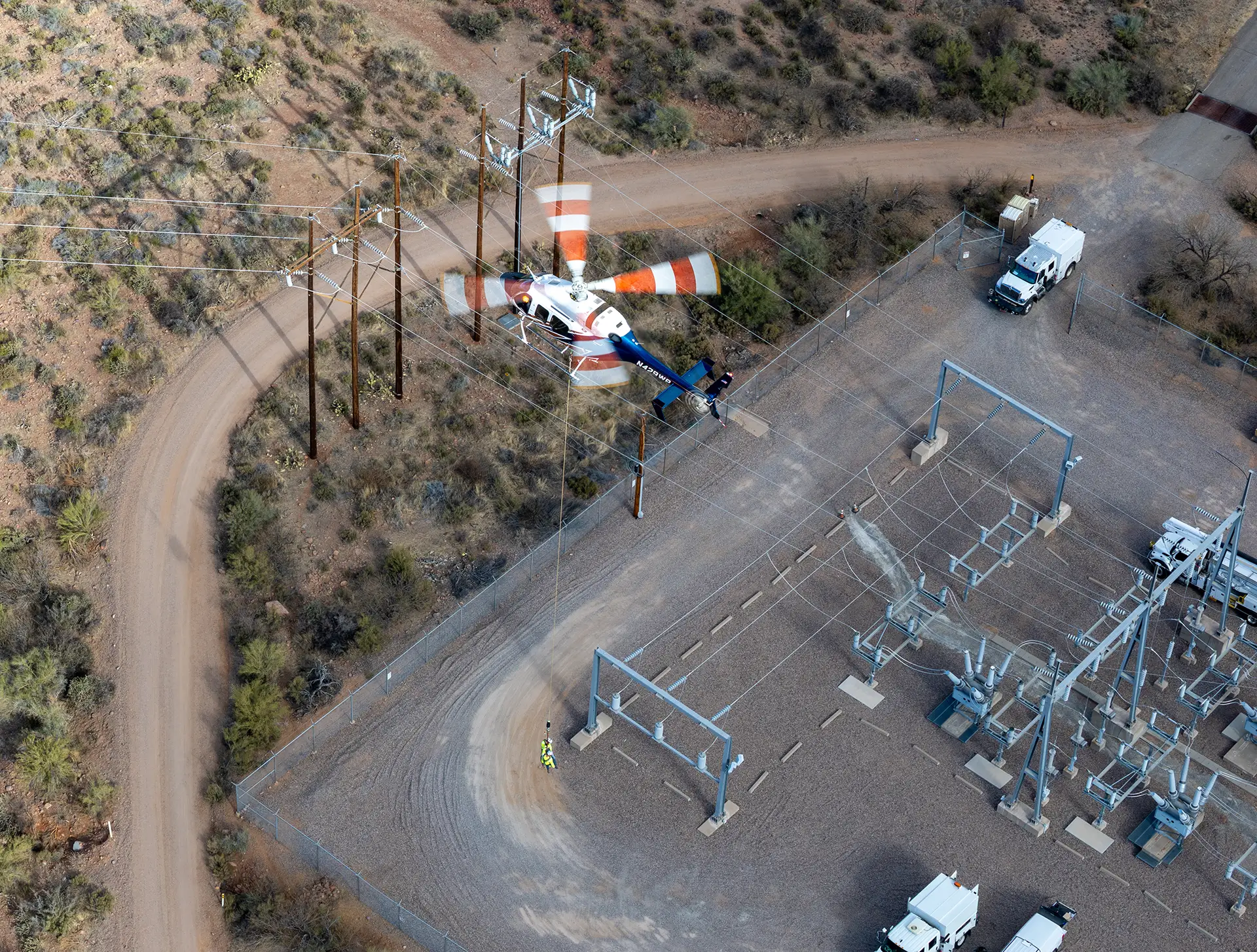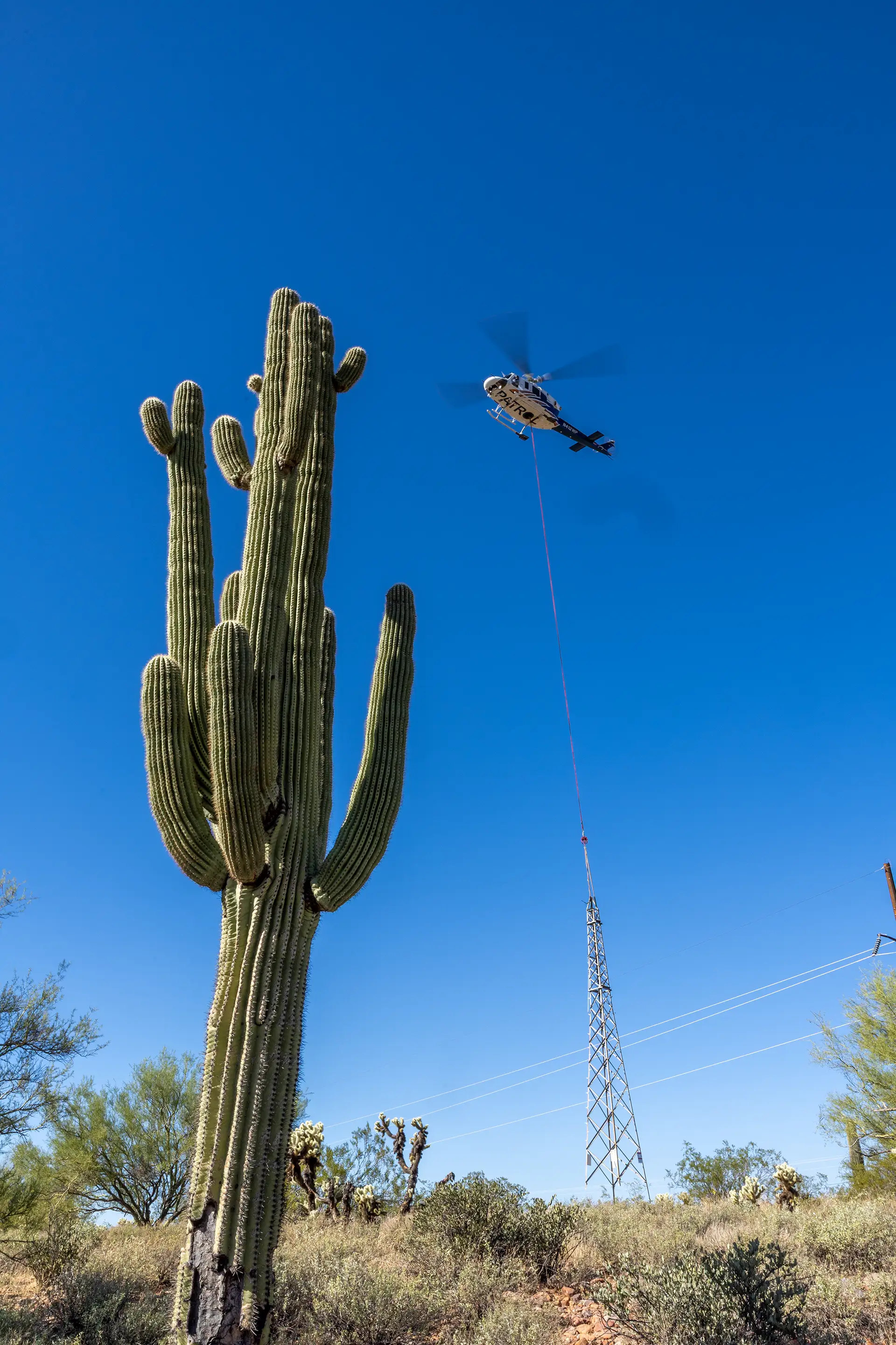 Apart from urgent repairs or outages, minimal flying occurs except during early mornings, as the extreme temperatures in summer limit operations. Consequently, the busiest time for aerial work is from autumn through to spring. Wegele explained, “We usually have a no-touch policy over summer because the temperatures are so hot, and we need every kW of power with customers’ air conditioners going non-stop, so we can’t afford for lines to be de-energized at that time. During the summertime is also when the pilots do a lot of their annual training, and the aircraft get their heavy maintenance. With the growth and increasing high temps in Phoenix, we are setting new records every year for the daily amount of power demanded and provided, hence why we wait until it’s cooler when we can get a power outage if we need to, plus the aircraft can lift more in the cooler temps.”