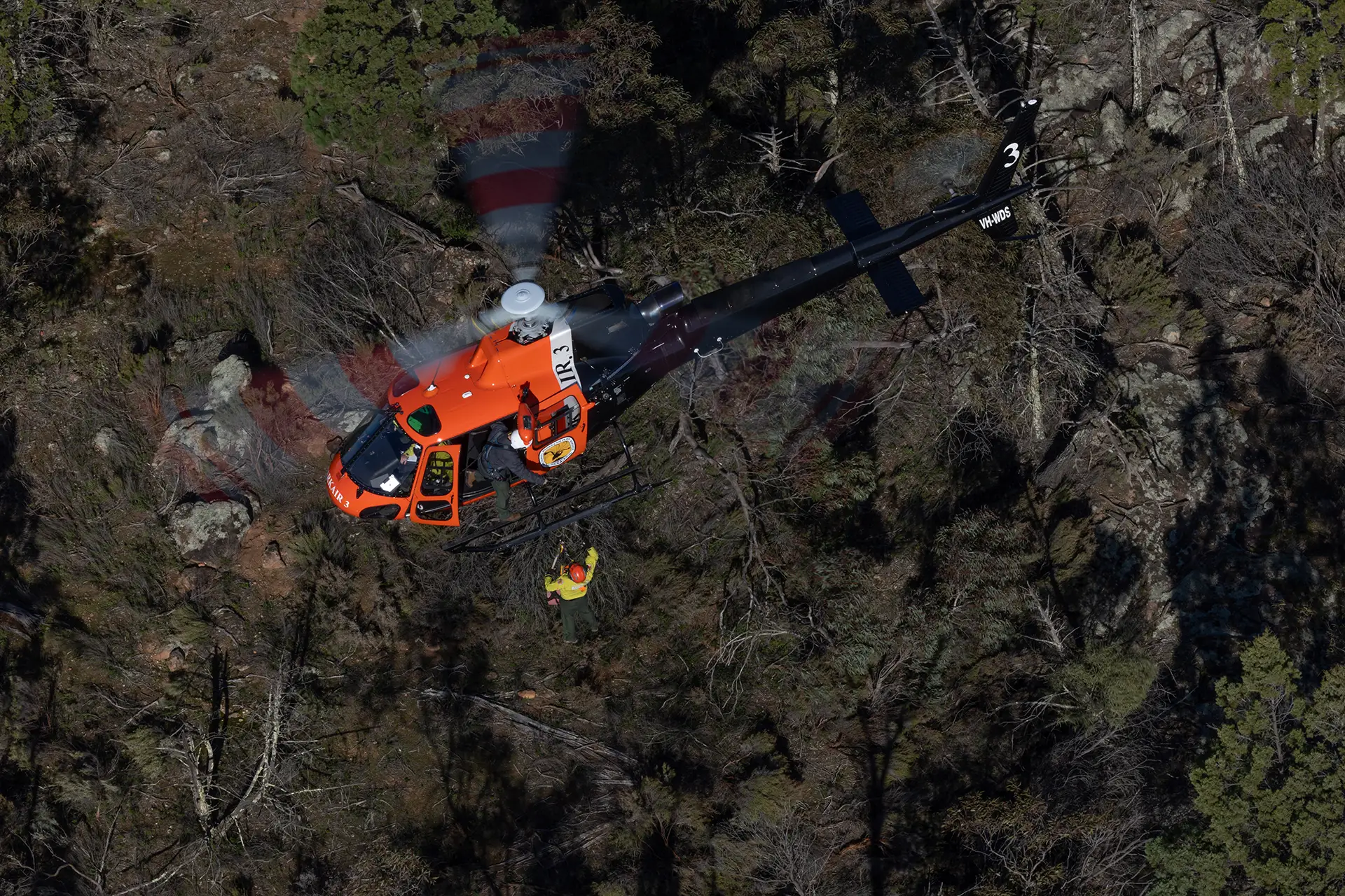 The hover exit is one of the more common insertion and extraction methods for NSW Parks firefighters in remote areas. Also known in other parts of the world as the hover STEP, hover exits require good situational awareness by the pilot and aircraft crew. Nestling the aircraft down between trees and easing one skid to a rock escarpment can be taxing and challenging, even in good conditions.