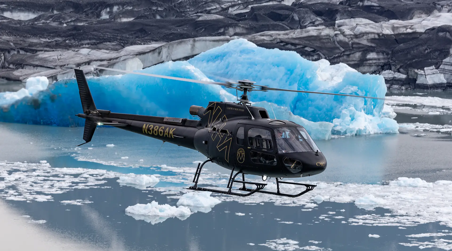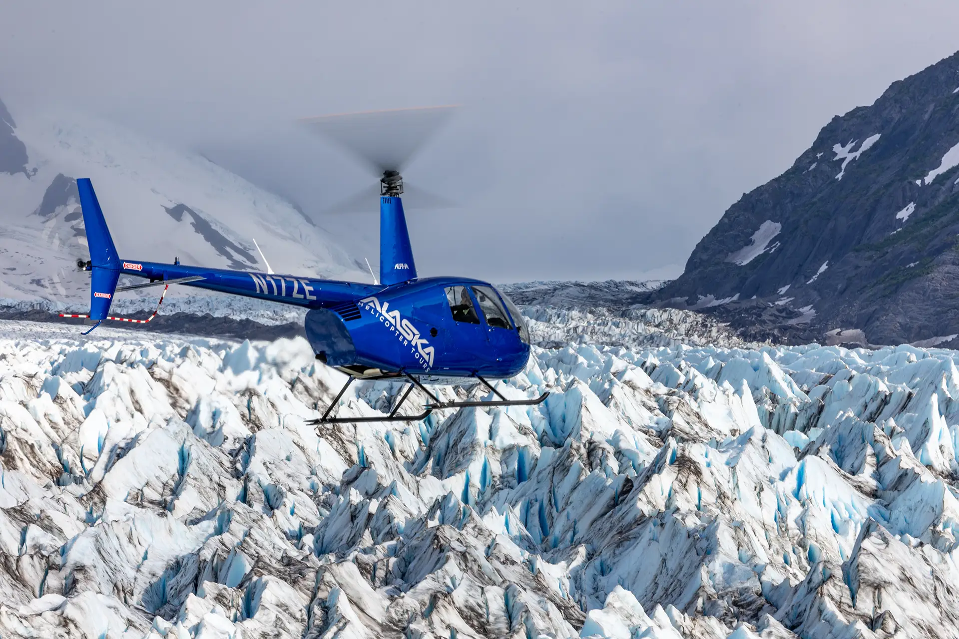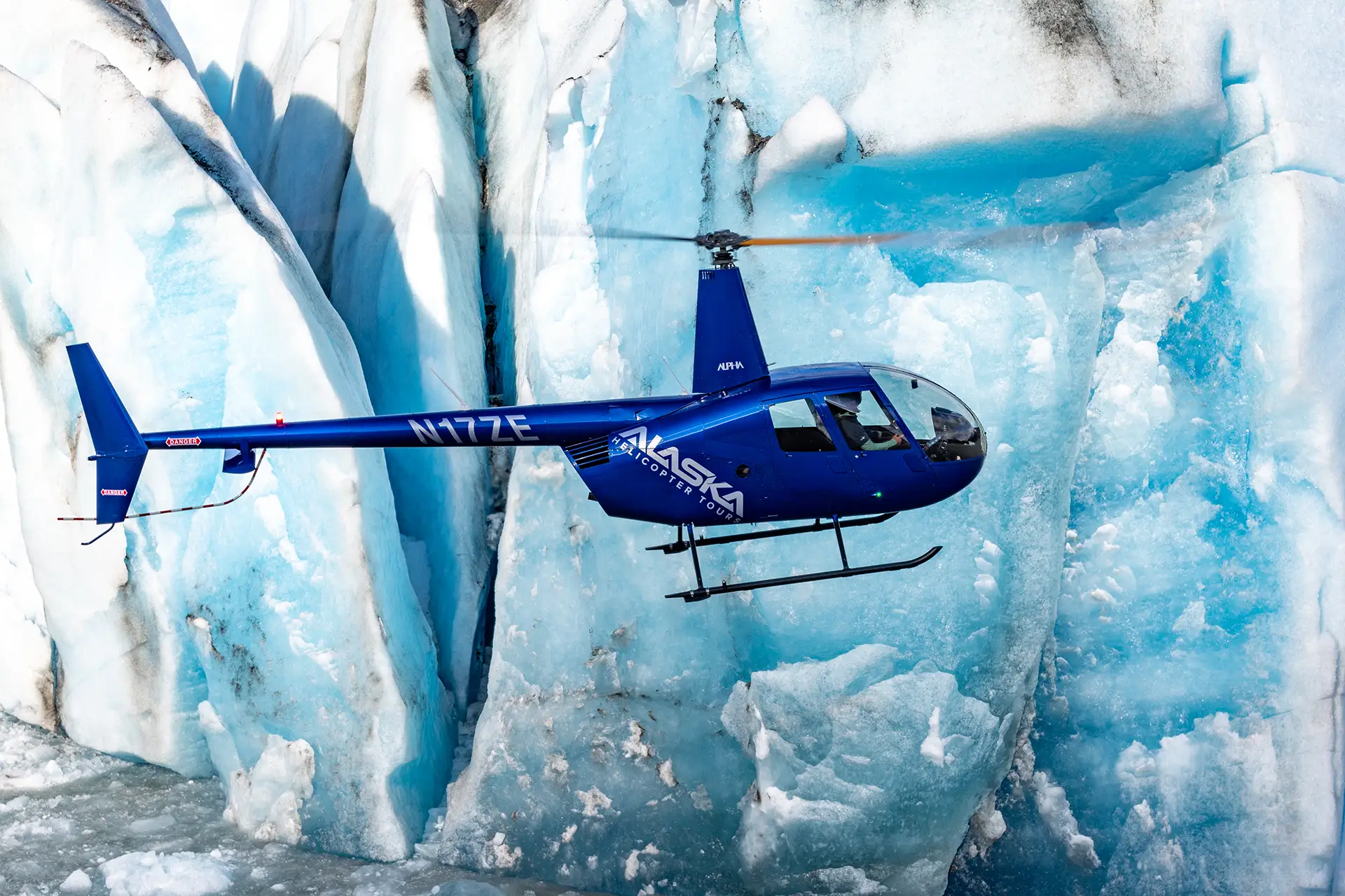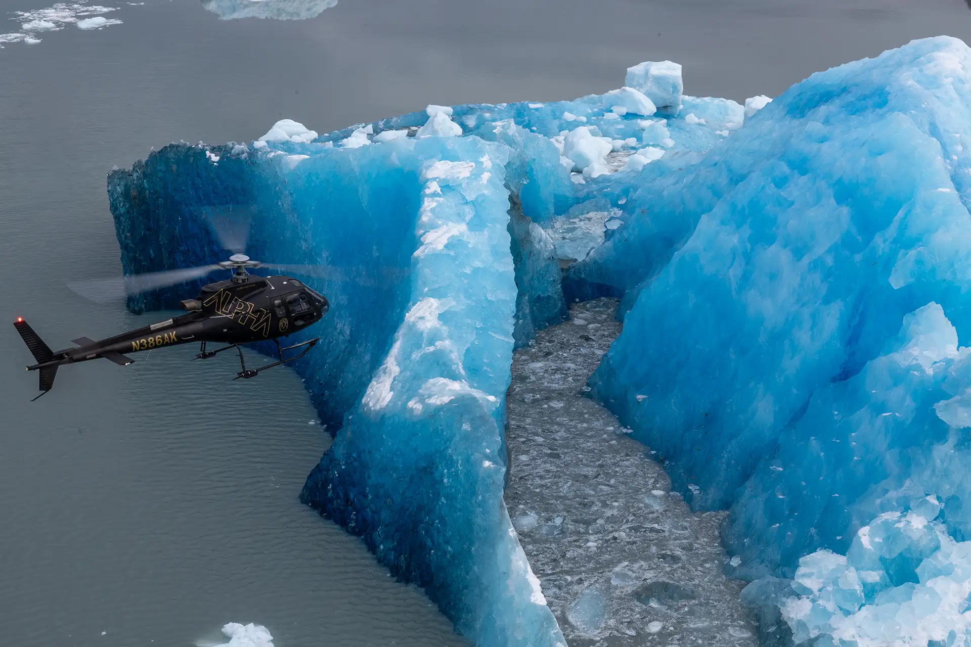 spectacular views over the entire Knik Valley, a landing at either an ice-wall or iceberg viewing area and a third landing on the glacier to